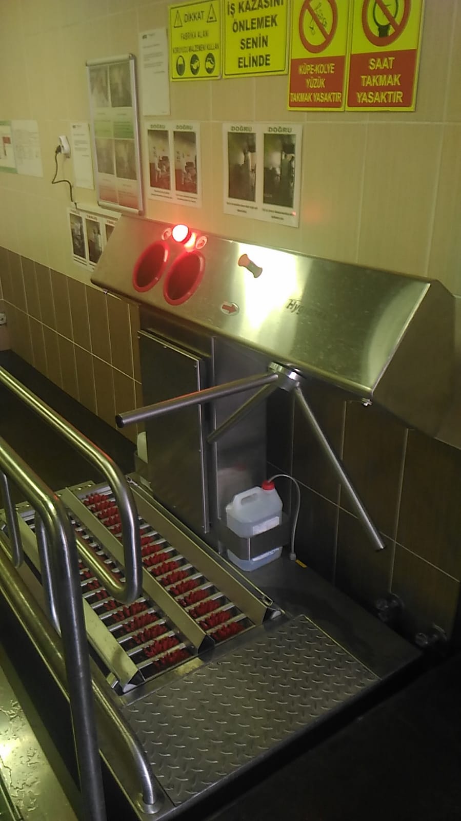 Taban Firçalamali Hijyen bariyeri ayakkabi kullanilan isletmeler için tasarlanmis olup, temassiz el kurutma (opsiyonel) ve çift el dezenfeksiyon islemlerini saglar. Yüksek güvenilirlikli rijit-robust olacak sekilde tasarlanmistir. Genel olarak çift-el dezenfektanli turnike geçis kontrolü, PLC sistemi ile islem takibi yapar ve herhangi bir asamanin atlanmasina izin vermez. Paslanmaz dezenfektan püskürtücü nozullar, yükseklik ayarli ayaklar, çizilmeyi önleyen plastik ayak kisimlari, ayak havuzunda yatay firçalar mevcuttur ve tamami paslanmaz çelik malzeme olacak sekilde üretilmektedir. CE sertifikali ve HACCP kurallarina uygundur.